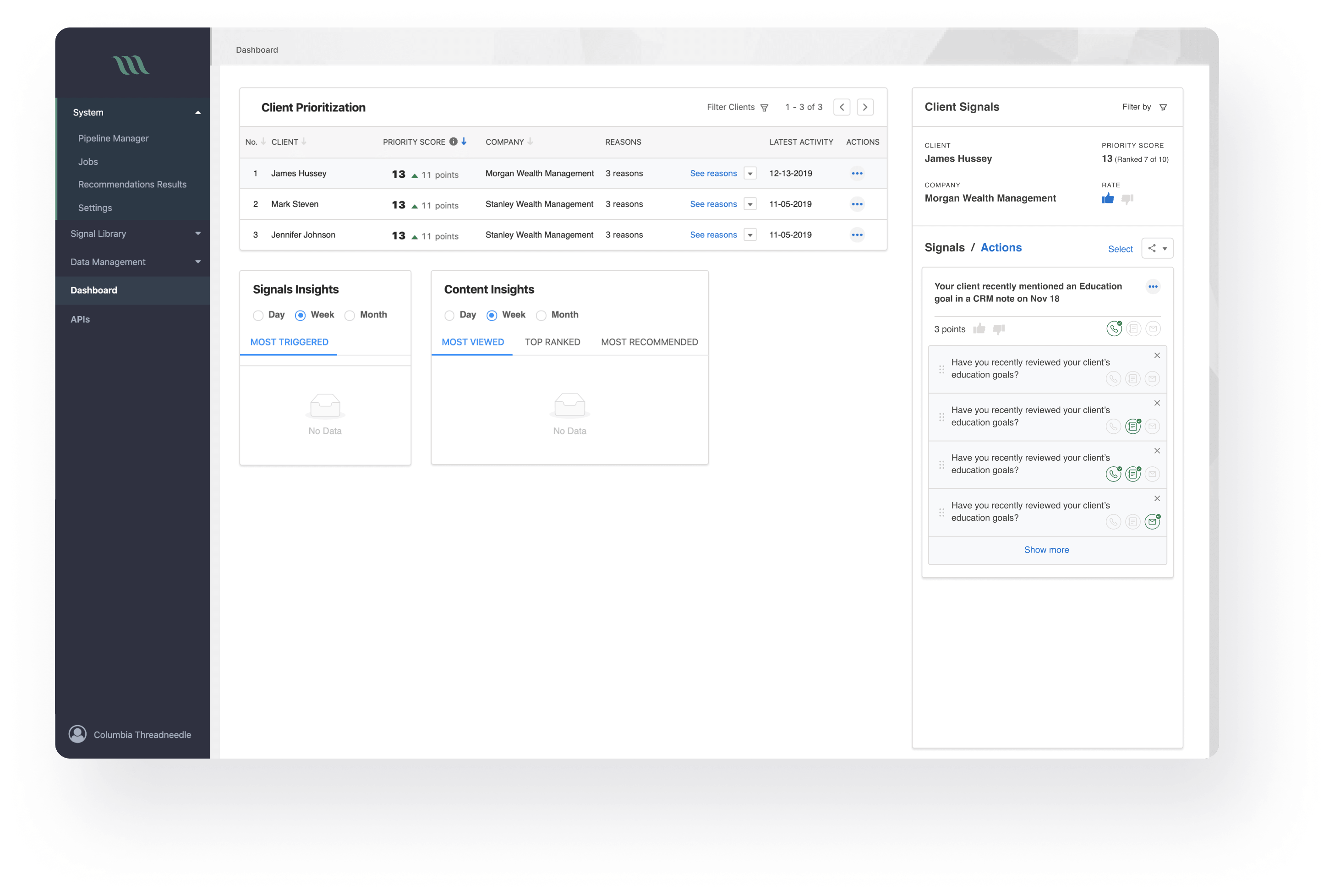 The system uses machine learning techniques to process various content feeds in real-time and boost productivity of a financial analyst or a client relationship manager in such domains as wealth management, commercial banking, fund distribution.