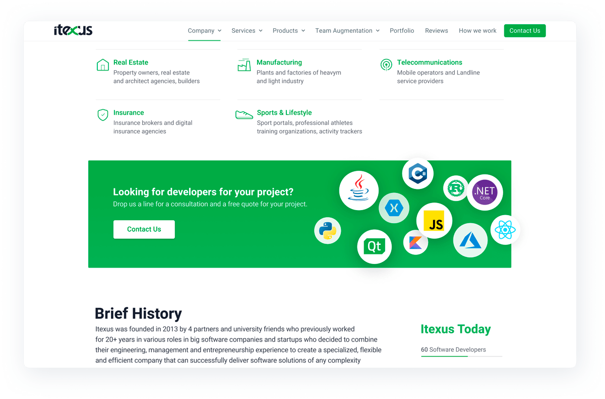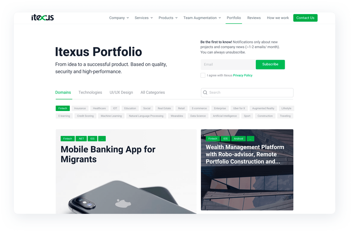 Thus, we have created a clear connection between domains, technologies, and Itexus experience in product development, which allows the visitor to comfortably navigate all projects Itexus completed in specific technologies or domains.