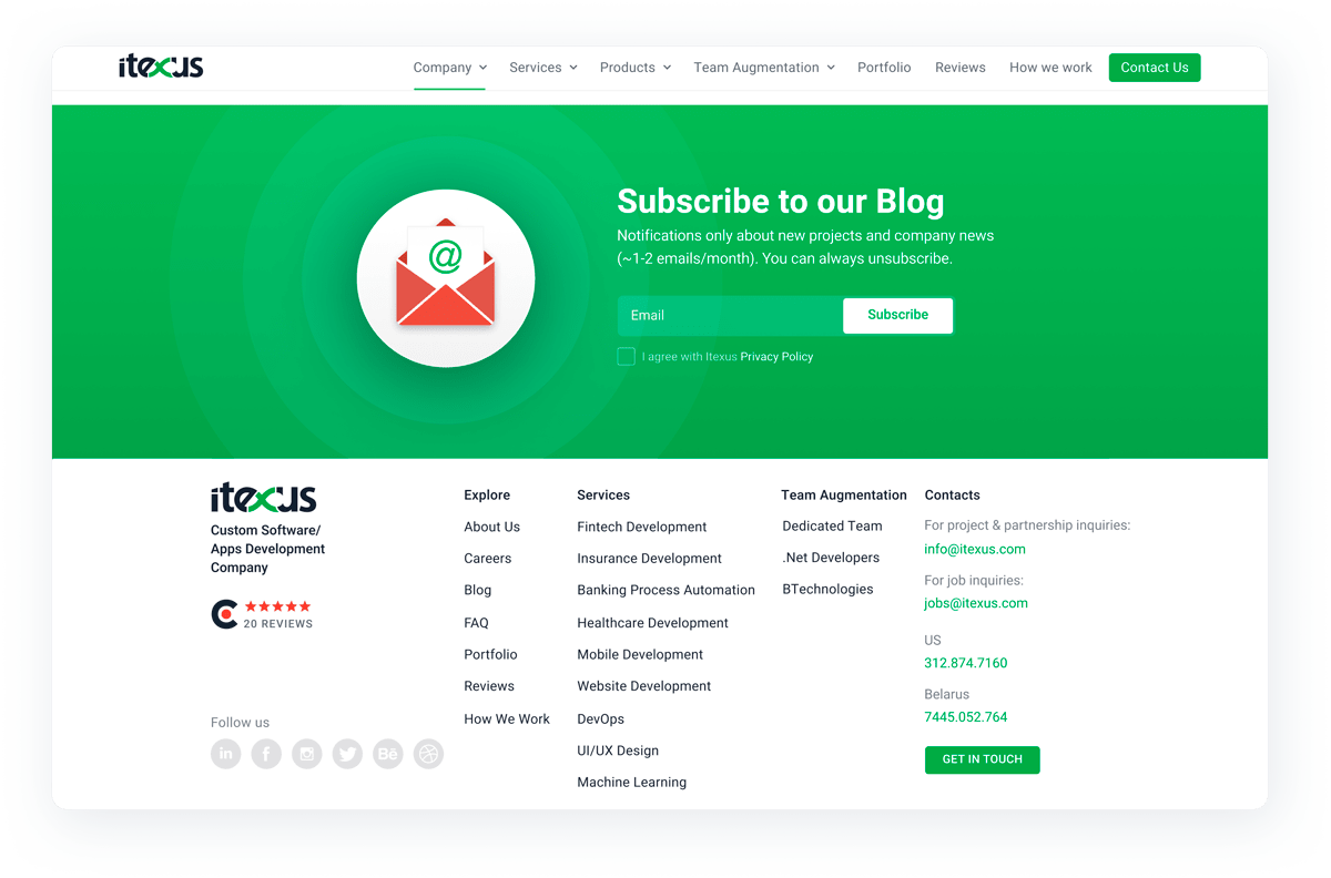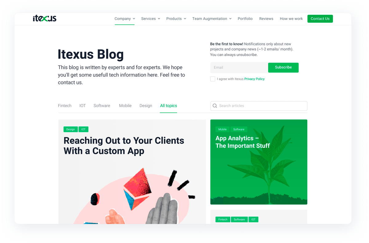 We improved the email subscription service as well. Now those who are interested in the company’s news can receive important updates. Once a month Itexus sends out a news digest to share a list of new blog articles and projects.