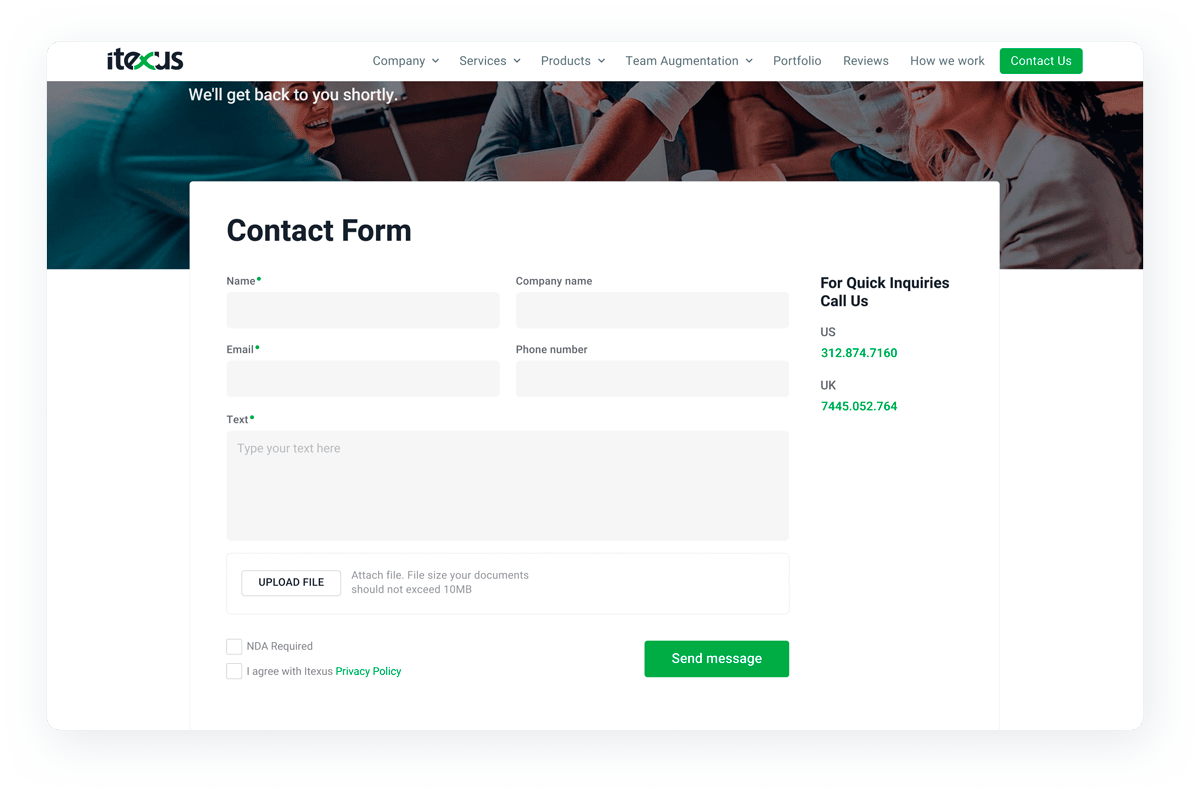 We have developed a custom contact form that does not allow spam to pass through. At the same time, we do not use captchas as they bog down the website’s performance. The contact form enables Itexus to collect the data for marketing activities.