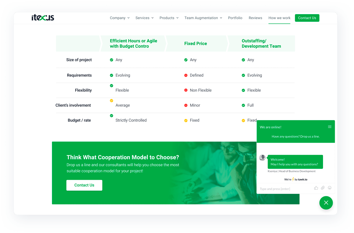 For greater user engagement with the site, we also added a chat where clients can communicate with the business developer manager. For this, we integrated Tawk.to chat which helps Itexus stay in touch with the site’s visitors and deliver a better digital experience to them. Later on we are planning to develop a smart chatbot using machine learning to automate the communication and decrease managers’ workload.